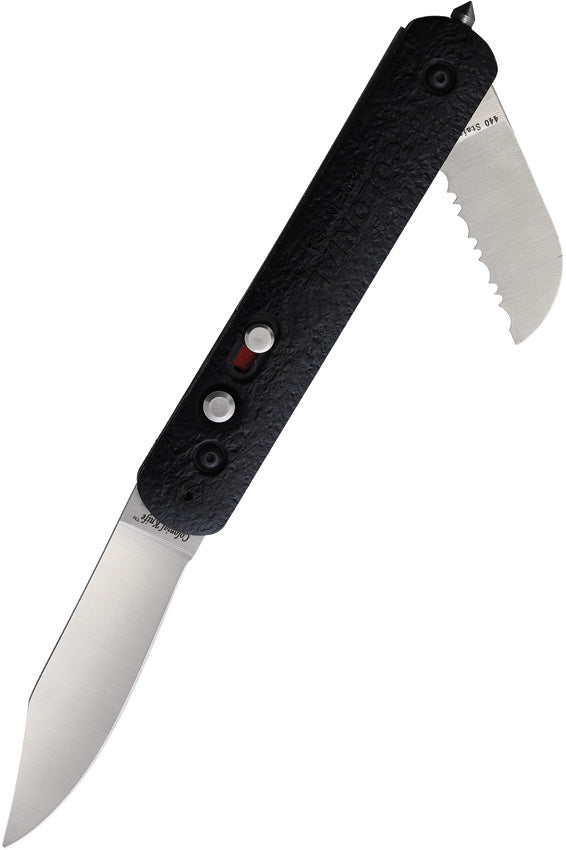 Automatic opening. 4.63" (11.76cm) closed. 3" (7.62cm) satin finish 440A stainless clip point blade. Glass breaker. Pocket clip. Manual folding sheepsfoot blade. Black GFN Isoplaste handle. Boxed.