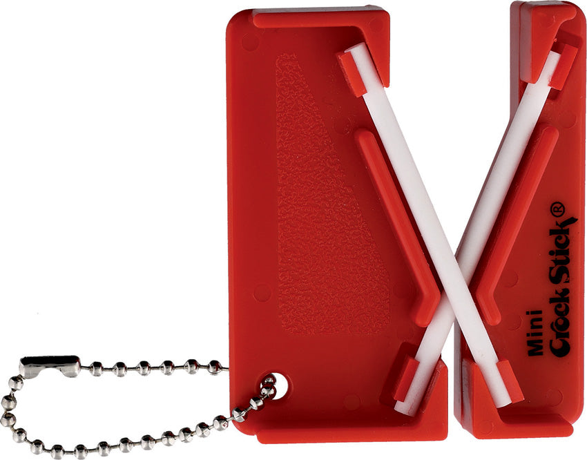Measures 2"" x 2 3/8"". Molded plastic construction with two alumina ceramic sharpening rods. Pocket size with keychain. Sharpens and polishes knives; fish hooks; darts; arrowheads; etc. Hang packaged. Color may vary.