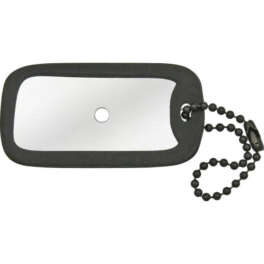 2 1/4" x 1 1/8". Double-sided hard chrome finished metal mirror is highly reflective. Rubberized silencer. Silencer color may vary. Black bead keychain. Package of five. Bulk packed.